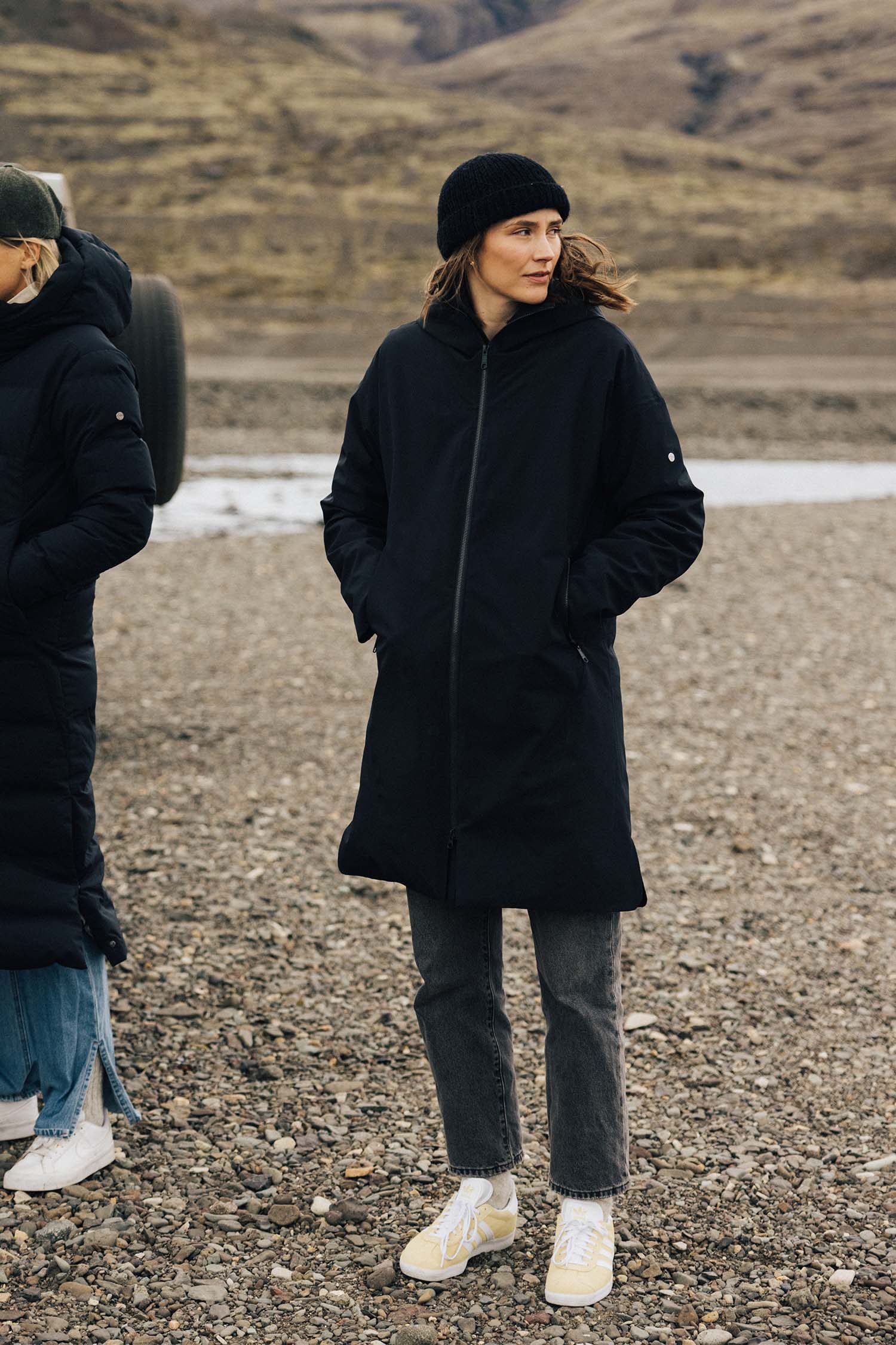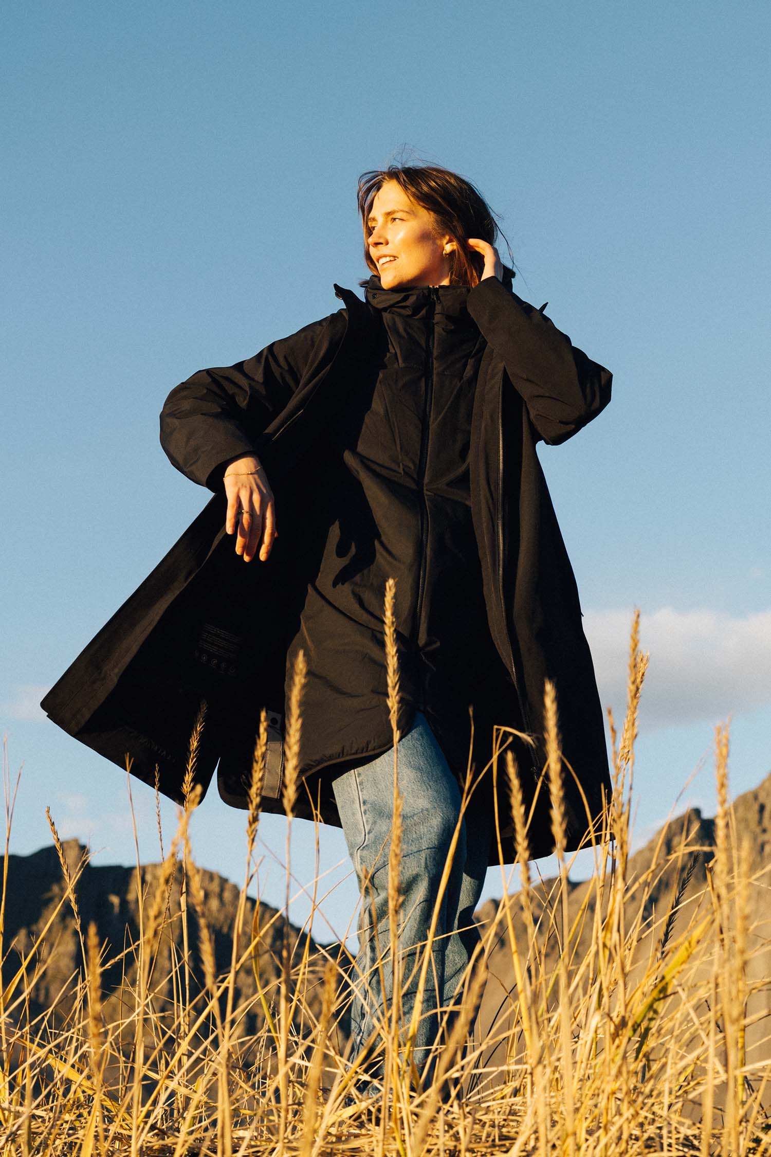 Aurora is a Regular coat, meaning that it is designed for average shoulder width and square-cut lines, making for a classic feeling. Typically a go-to if you like your clothes to be a bit wider. The regular fit gives you more space for sporting larger sweaters or several layers of insulation underneath.