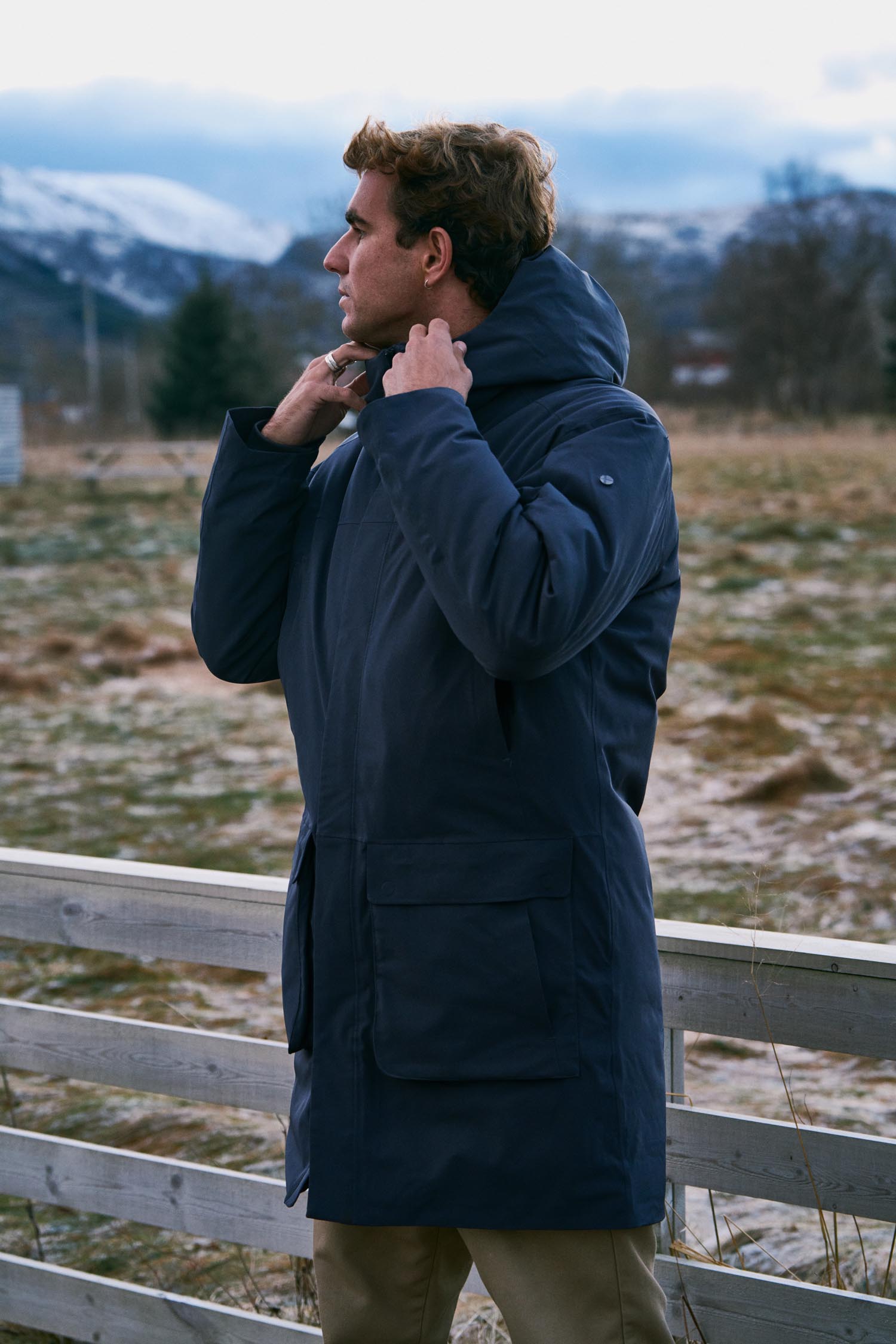 Guard II is a Fitted coat, meaning that it is designed to follow the body's natural lines without tapering. Fitted is a versatile shape that feels slightly narrower than a regular fit but with more room than a slim fit.