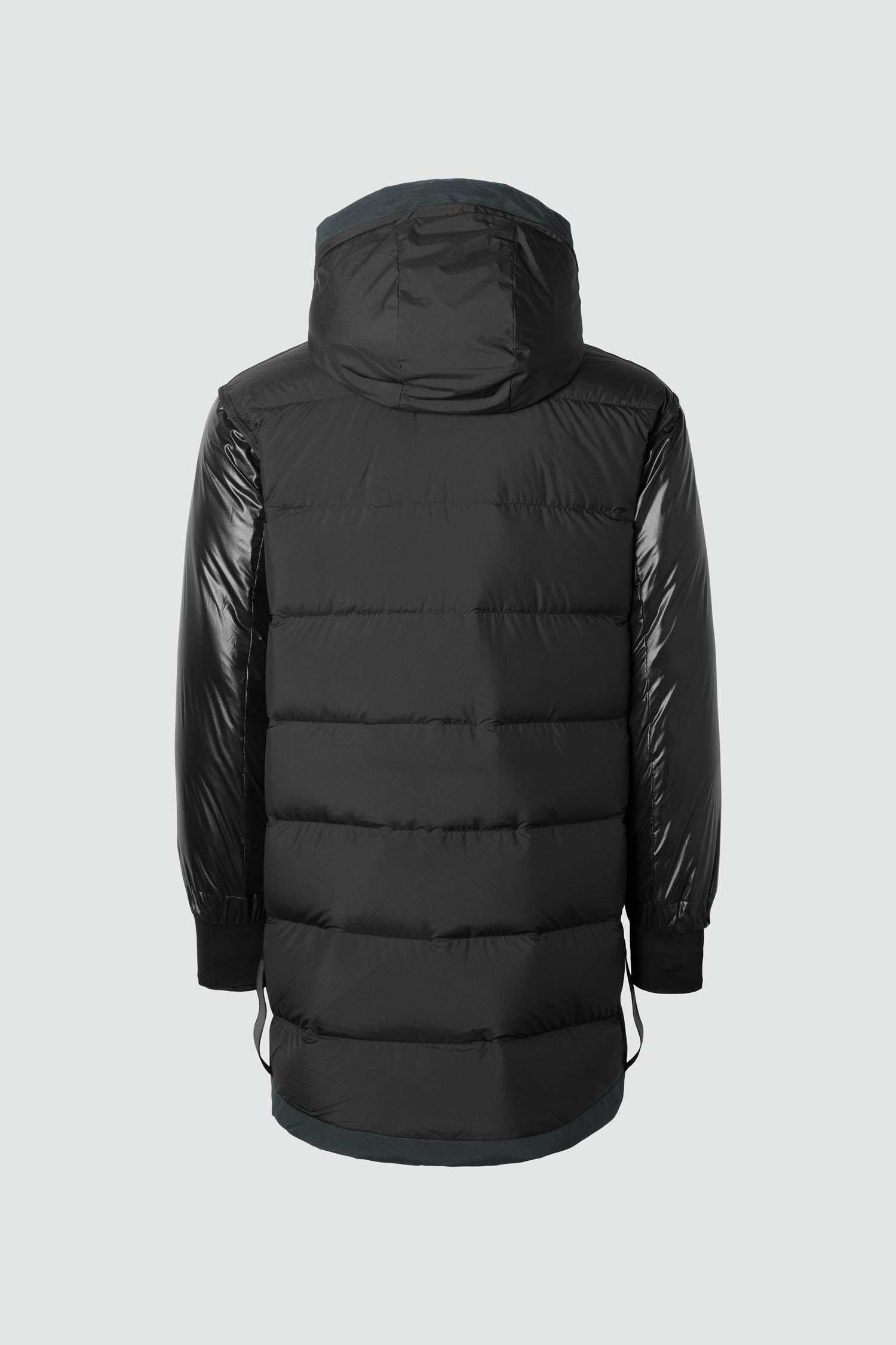 The mid-length design and welded down channels provide reliable warmth, while wind- and water-resistant stretch fabric ensures comfort and mobility in harsh winter conditions. Waterproof zippers, ample storage pockets, and a fixed hood add both function and refinement.
