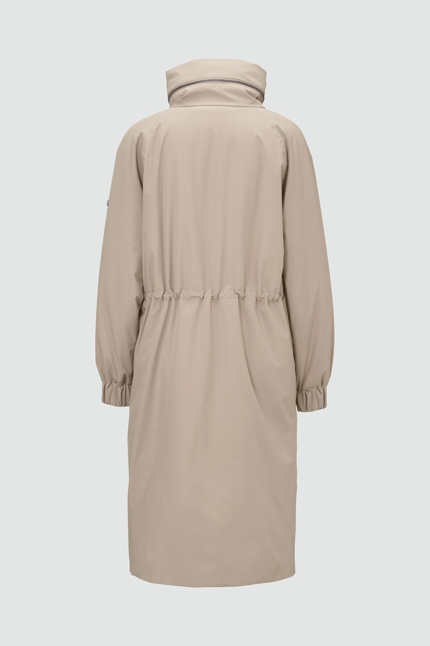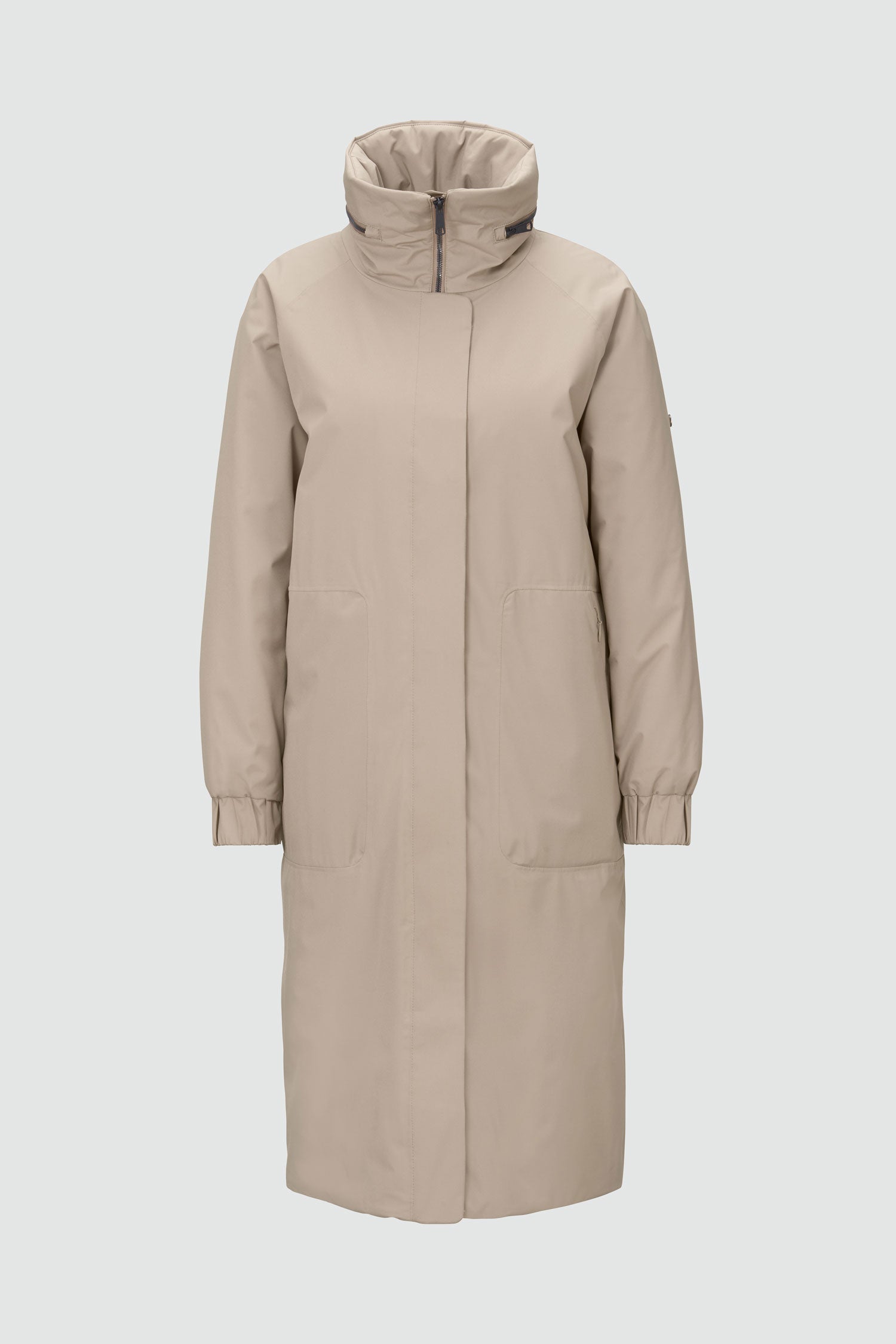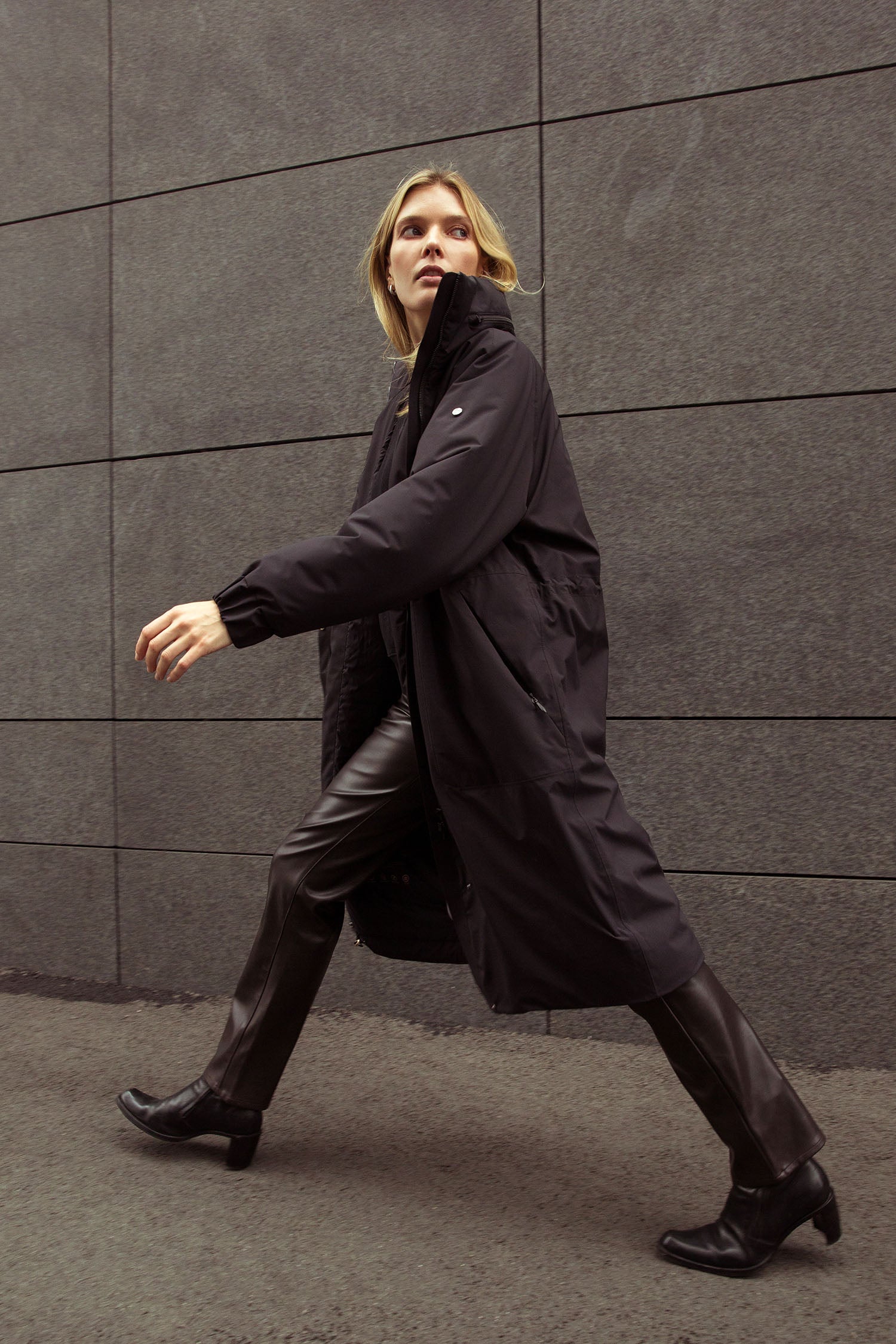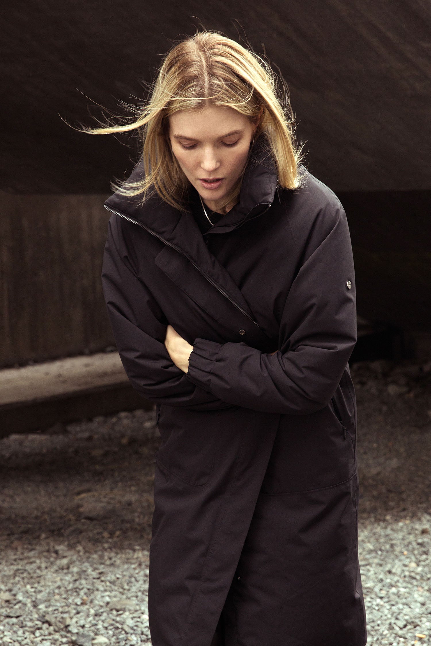 Zenith is an oversized women’s parka. The outside is clean with integrated pockets with concealed zippers for subtle detailing. The internal drawstring in the waistline lets you change up the fit as you please. The inside is clean without quilting, which minimizes cold spots and enables us to use less insulation and reduce weight – while still maintaining superior warmth. Good from early fall to late spring. The tall collar is hiding a packable hood for when the weather gets really rough.